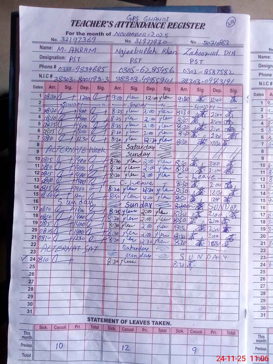| CNIC | Full Name | Designation | R/C | Absence during last cal. month |
