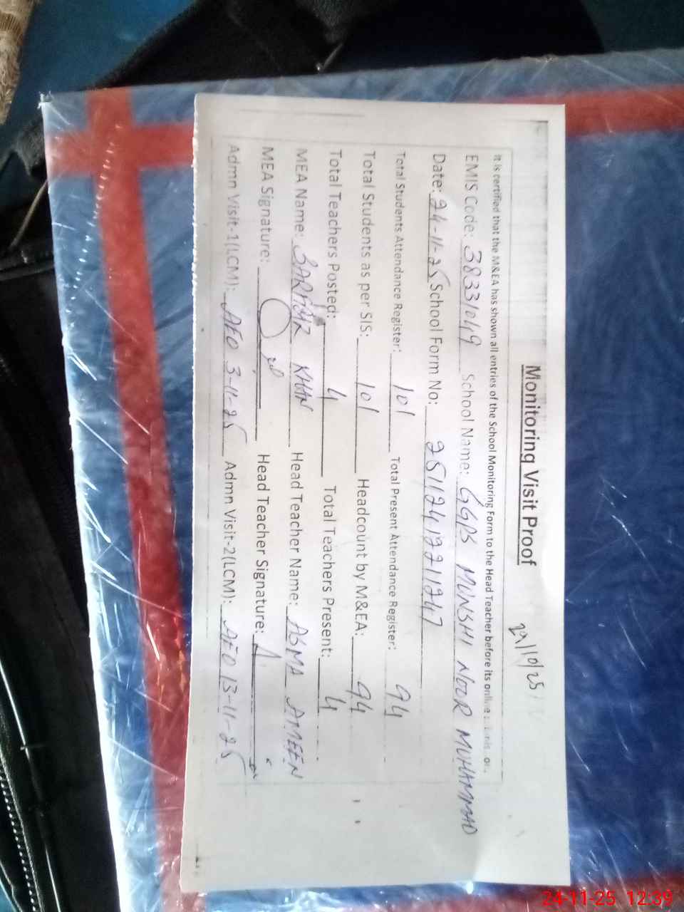 | Attendance Register | Head Teacher | MEA with School | Visit Proof |