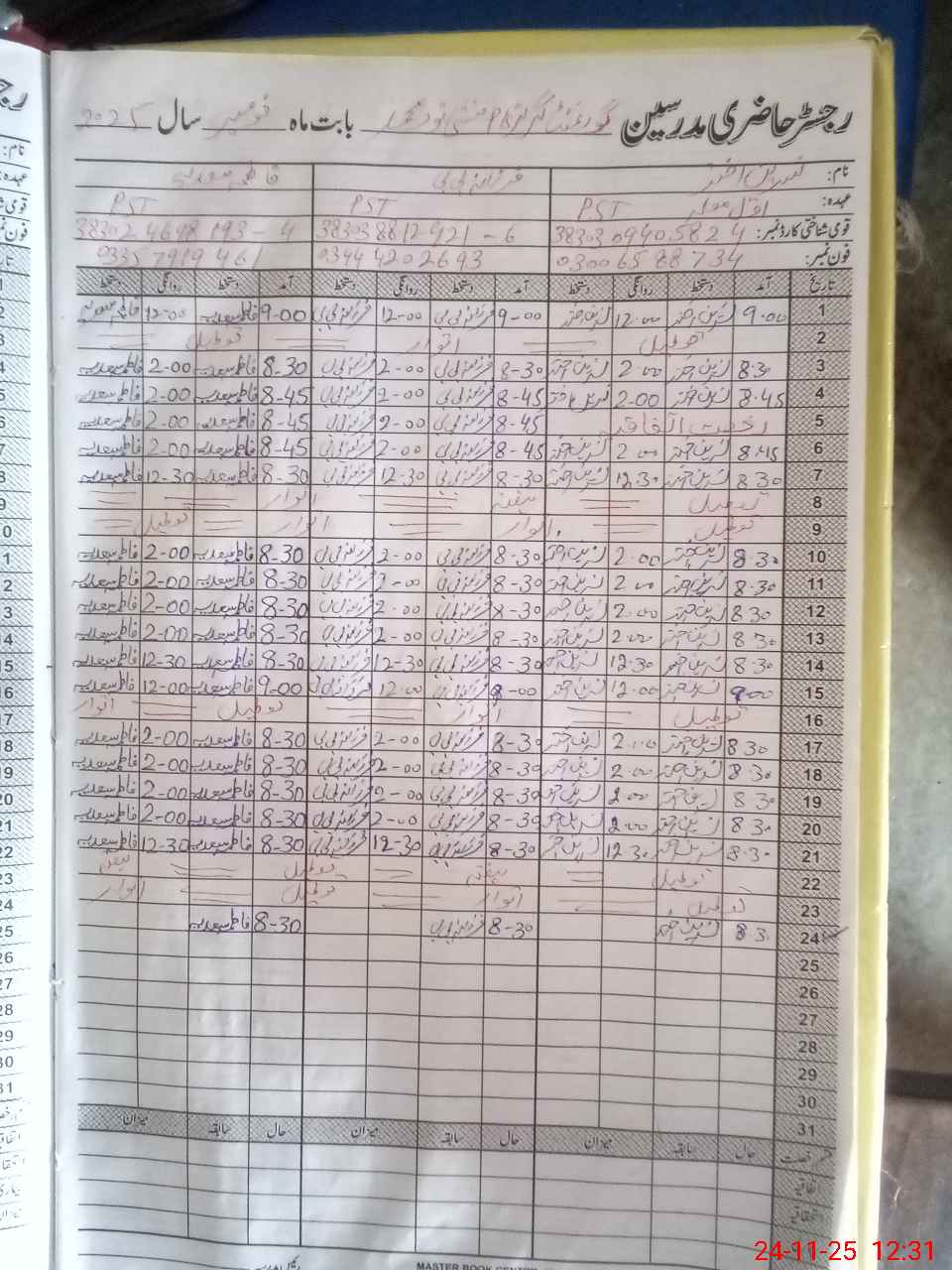 | CNIC | Full Name | Designation | R/C | Absence during last cal. month |
