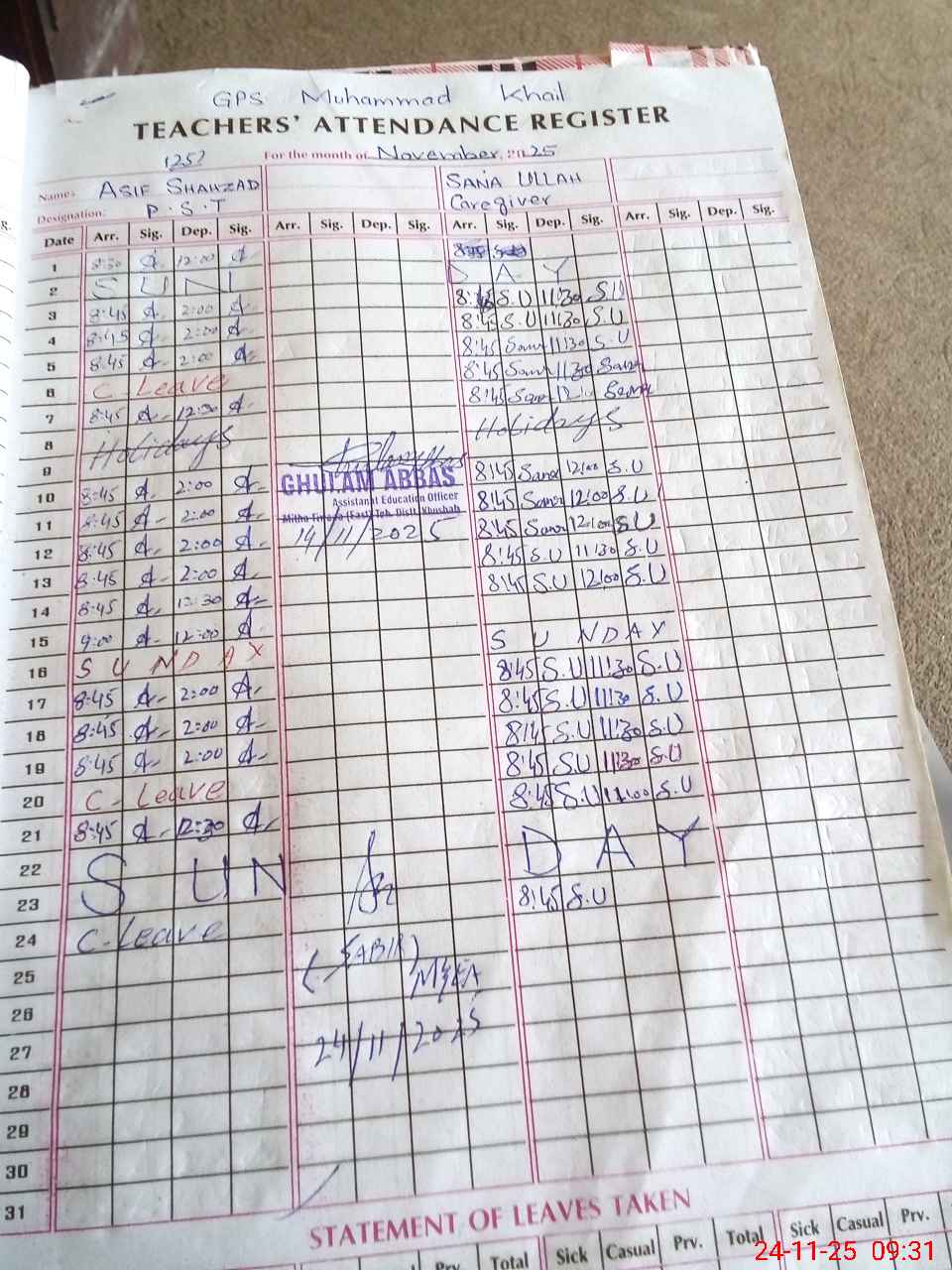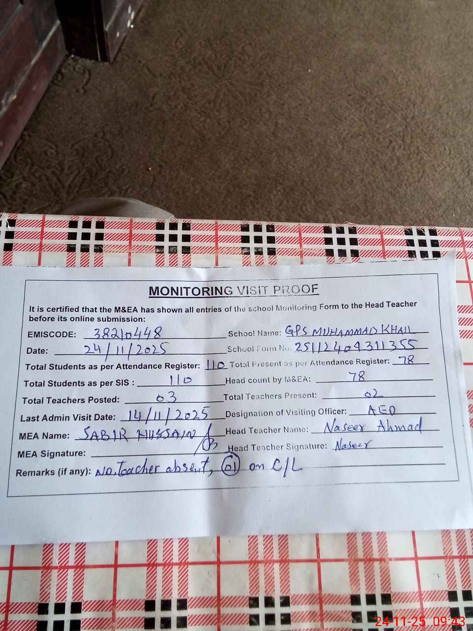 | Remarks (Use Separate Page if Required): last admin visit by AEO on 14 Nov 2025 total students 110 present students 78 | |||||