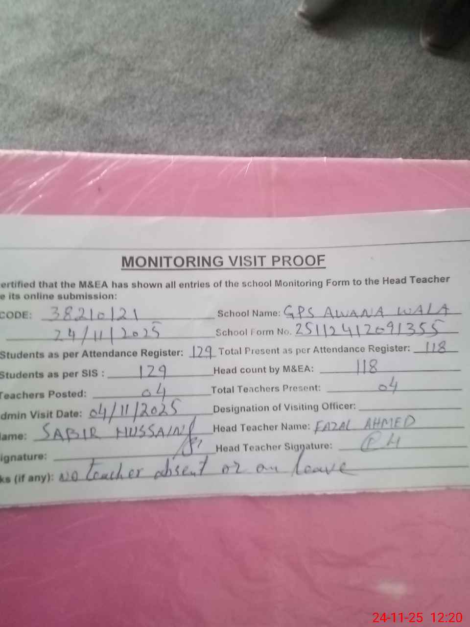 | Remarks (Use Separate Page if Required): no teacher absent last admin visit by AEO on 04 Nov 2025 total students 129 present students 118 | |||||