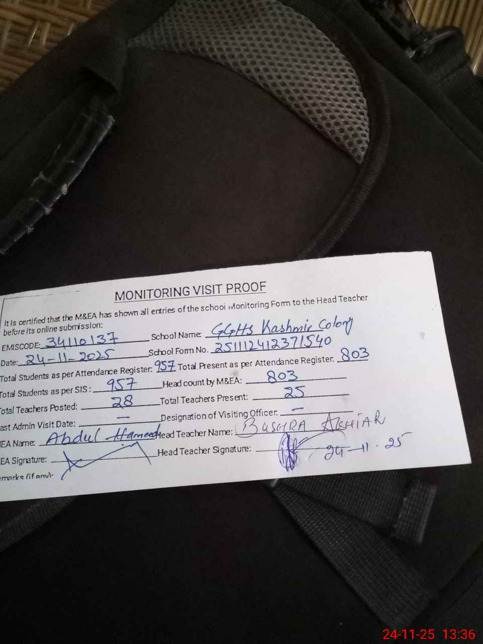 | Attendance Register | Head Teacher | MEA with School | Visit Proof |
