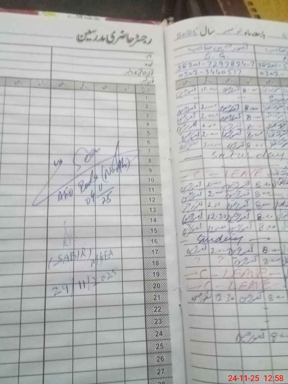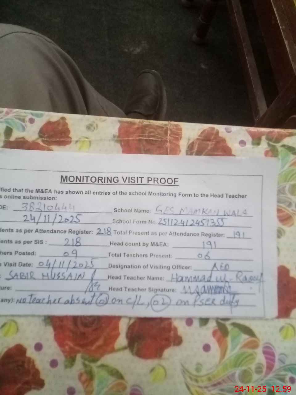 | Remarks (Use Separate Page if Required): no teacher absent total students 218 present students 191 last admin visit by AEO on 04 Nov 2025 | |||||
