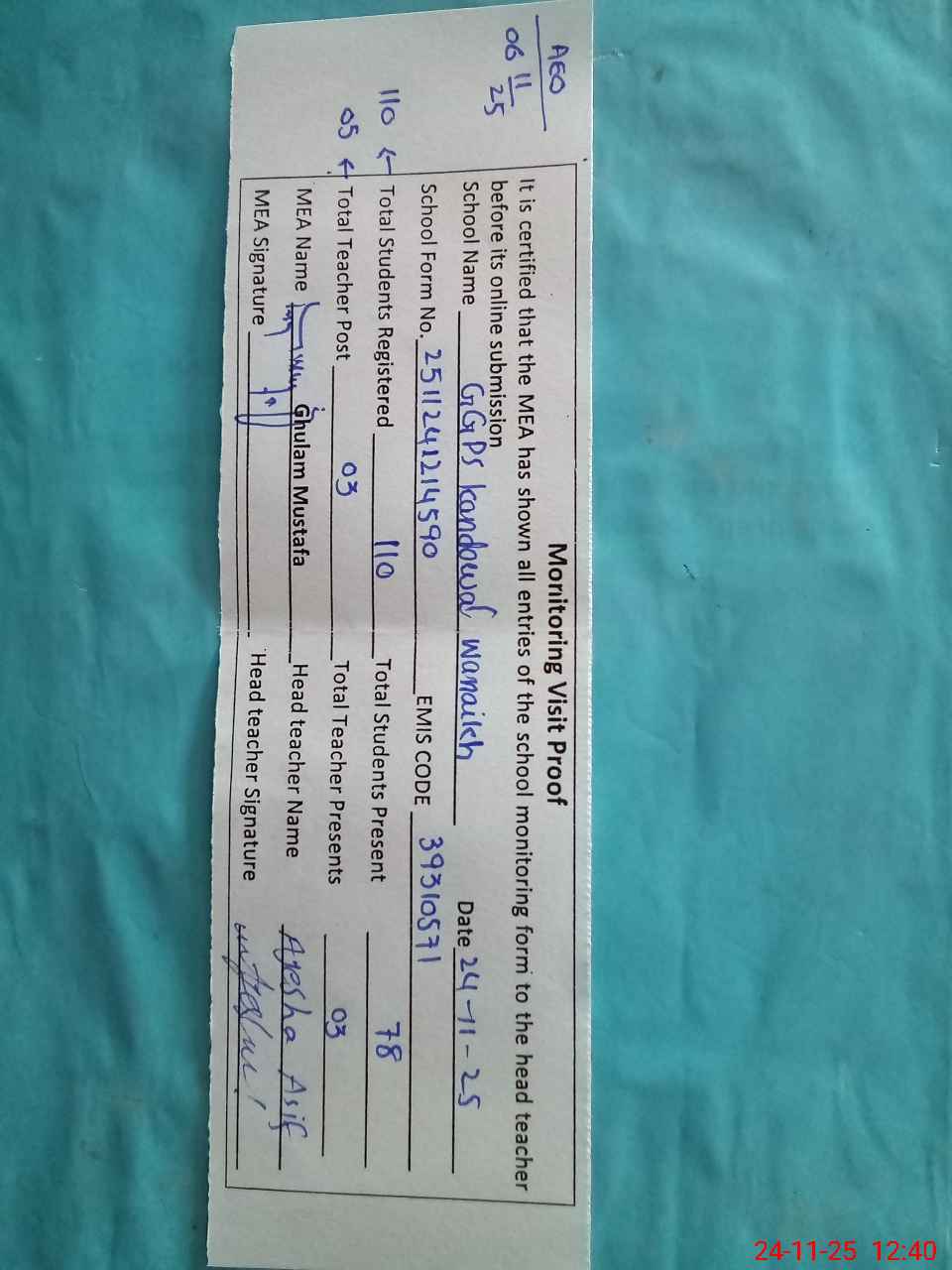 | Attendance Register | Head Teacher | MEA with School | Visit Proof |