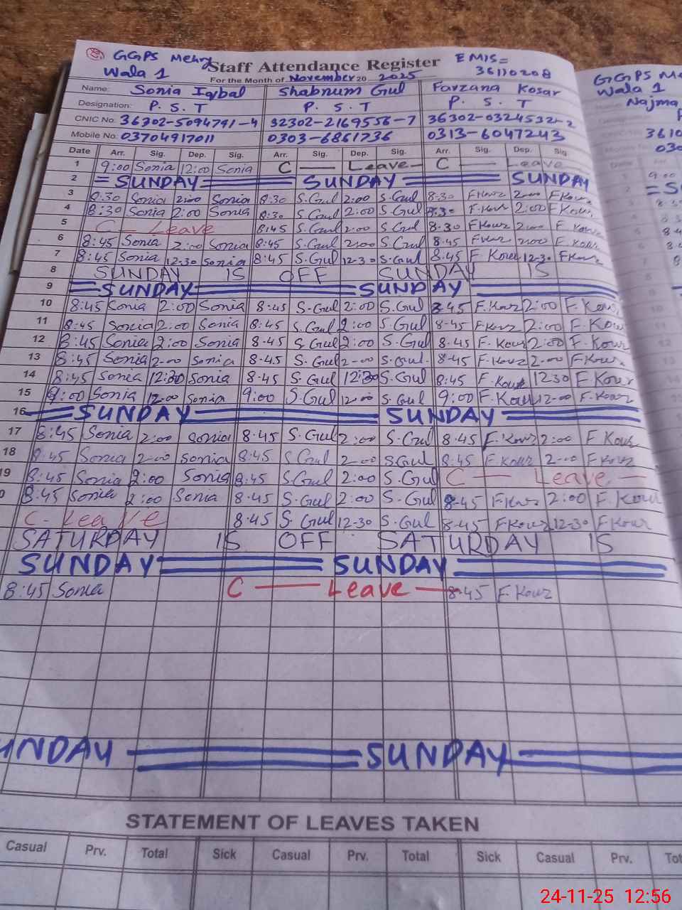 | CNIC | Full Name | Designation | R/C | Absence During Last Calender Month |