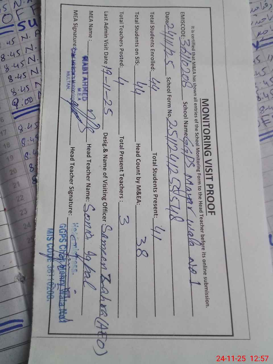 | Attendance Register | Head Teacher | MEA with School | Visit Proof |