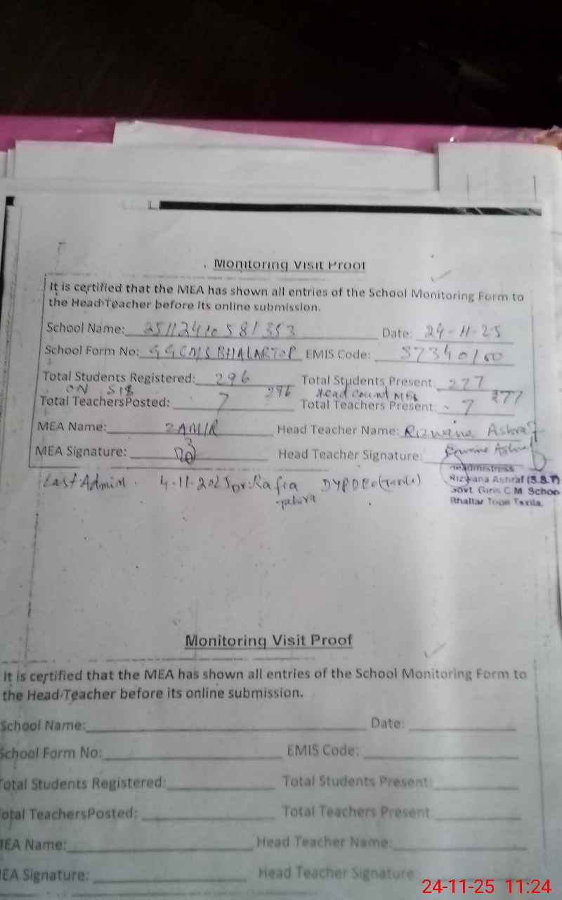 | Monitoring Date: 24-11-2025 | Start Time: 24-11-2025 10:31 AM | End Time: 24-11-2025 11:25 AM | Name of MEA: Za**** Ah**** | |