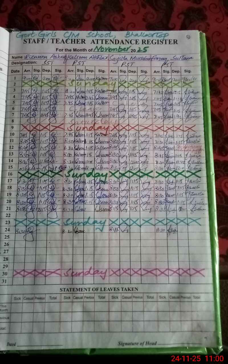 | CNIC | Full Name | Designation | R/C | Absence During Last Calender Month |