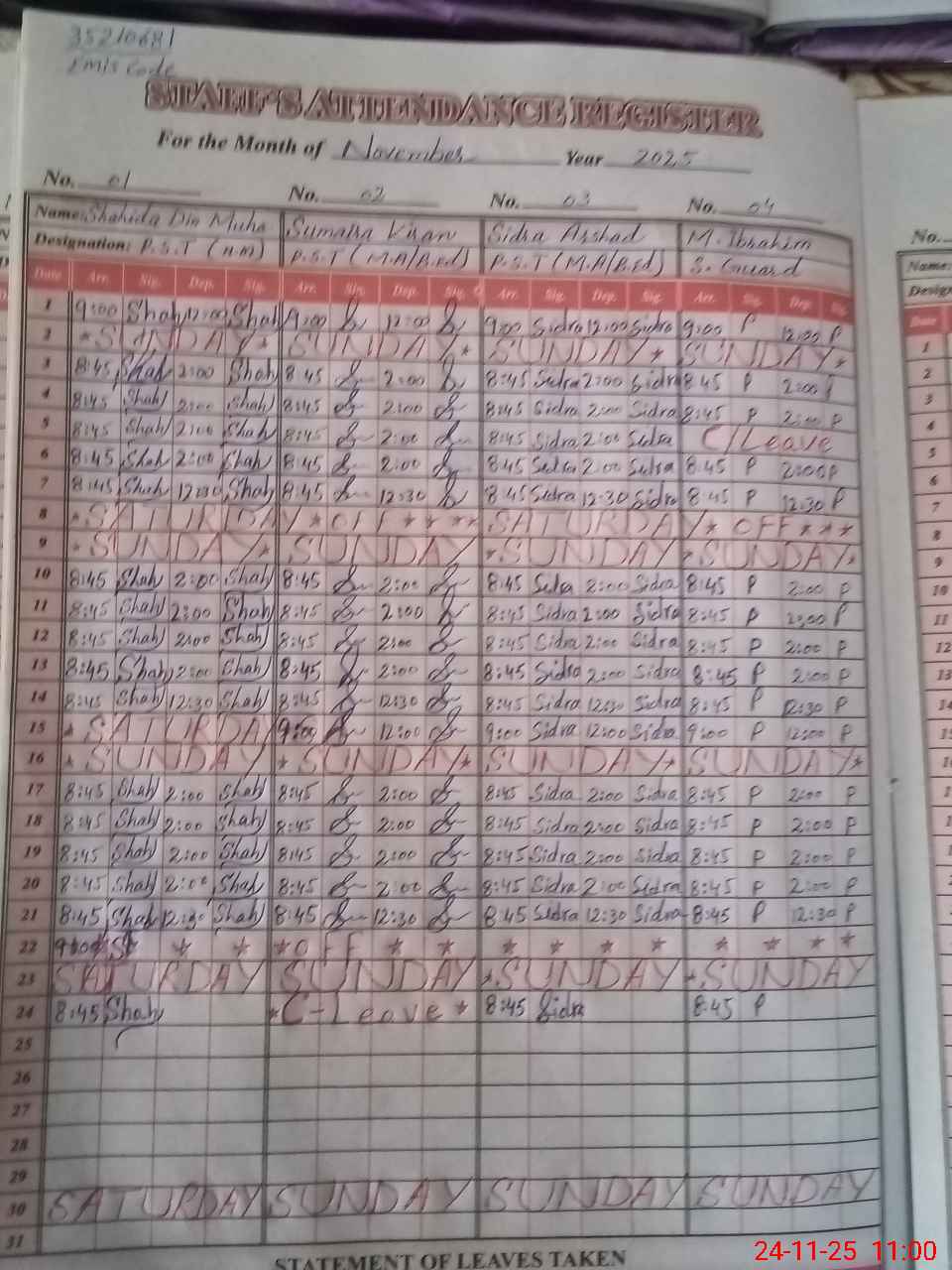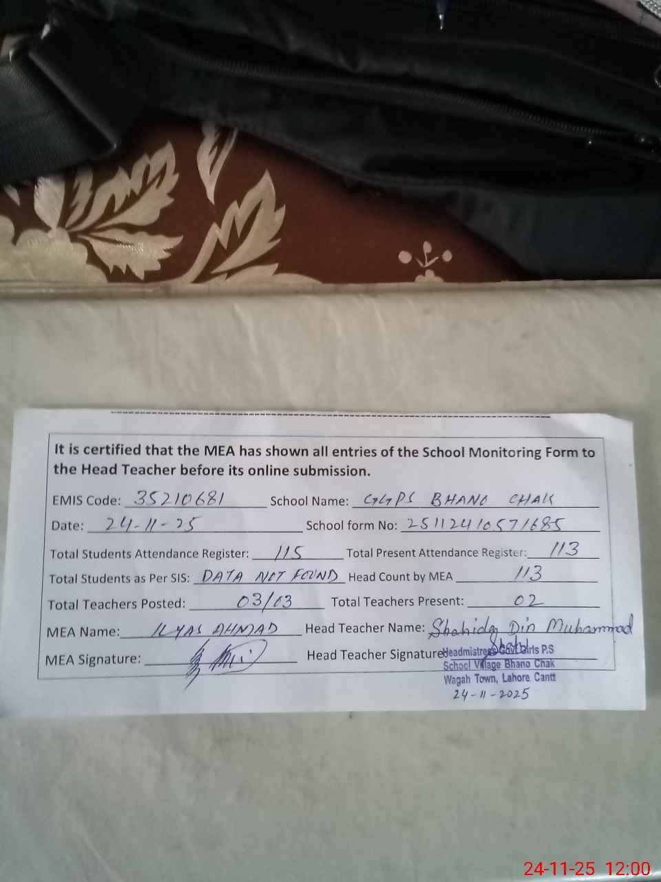 | Remarks (Use Separate Page if Required): AEO visit on 21 November 2025 and no visit in last month Dy DEO visit on 21 November 2025 Student strength on SIS is not shown due to Network is not available | |||||