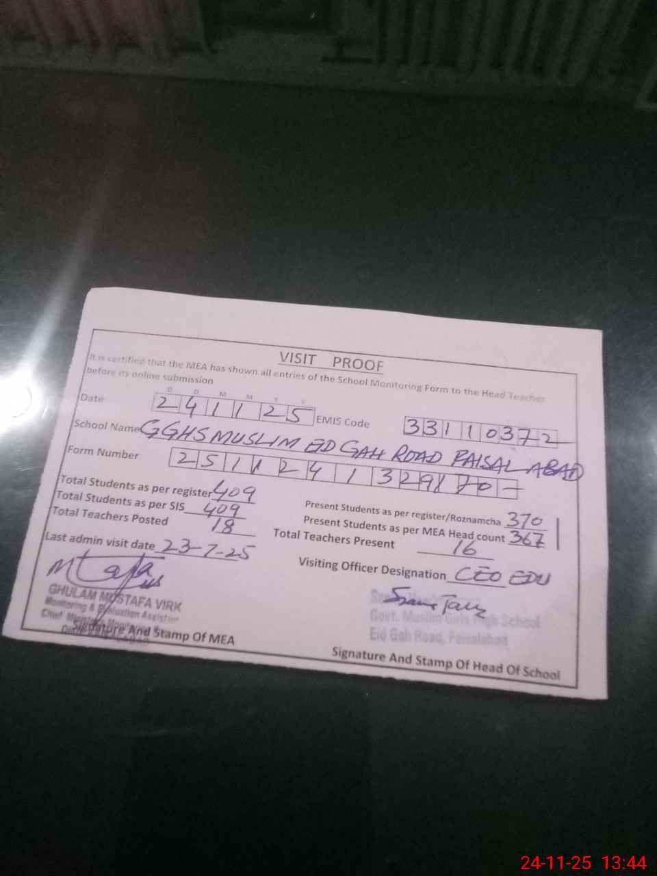 | Attendance Register | Head Teacher | MEA with School | Visit Proof |