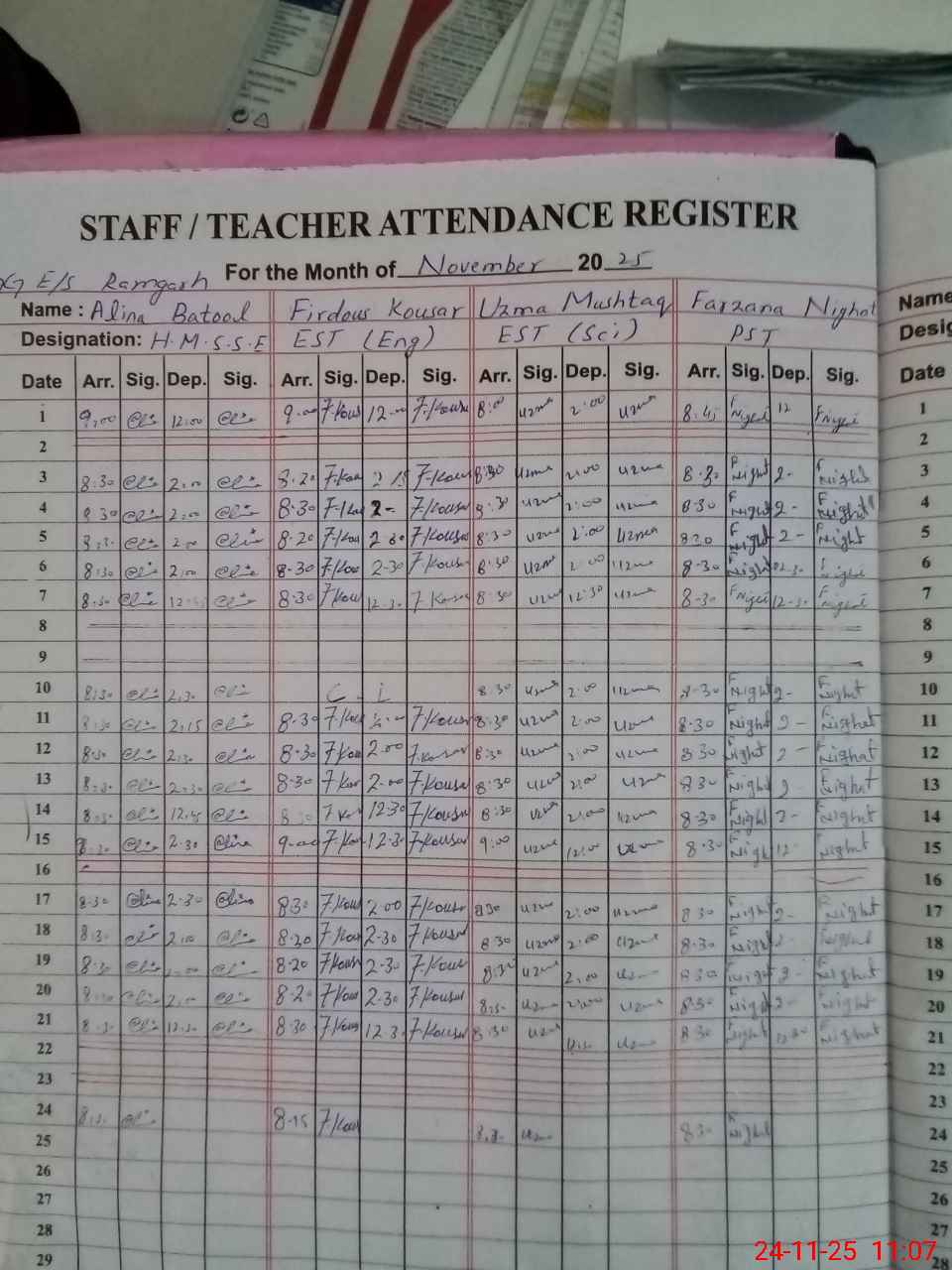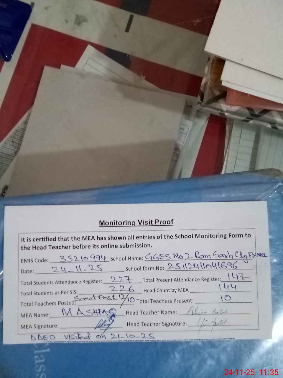 | Remarks (Use Separate Page if Required): DDEO visited on 21-10-25 No AEO visit in October 25. Last AEO Sadaf Ameen visited one year ago approximately Teachers Sanctioned Post 12 Filled 10 Bank statements of both accounts missed Non Teaching Sanctioned Post 03 Filled zero 35210994 | |||||