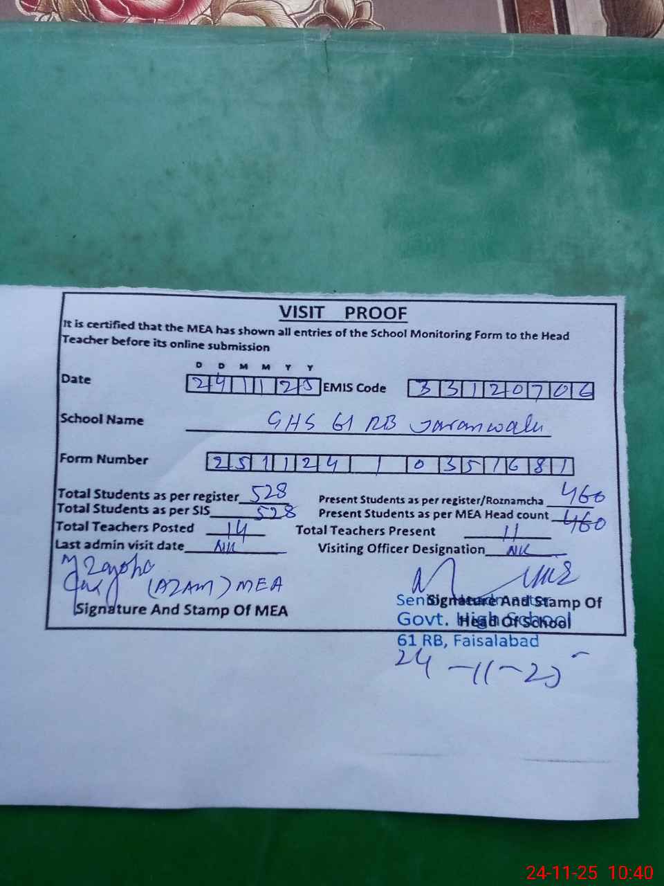 | Attendance Register | Head Teacher | MEA with School | Visit Proof |