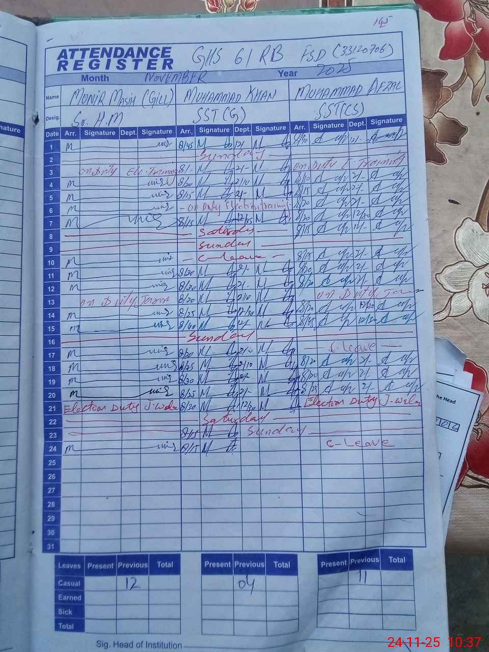 | Leave | Duty | Absent | Maternity | Medical | Ex- Pak |