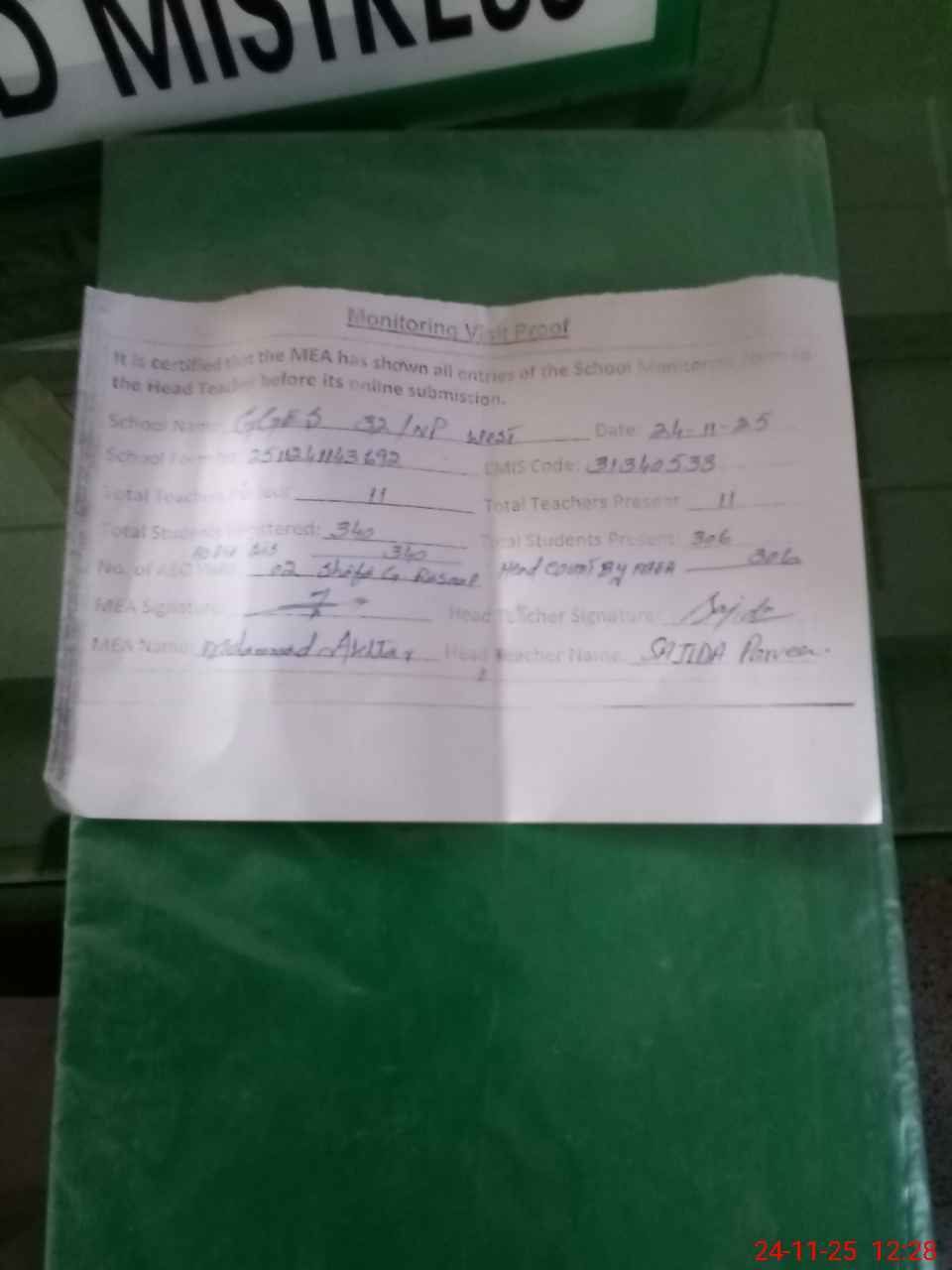 | Attendance Register | Head Teacher | MEA with School | Visit Proof |