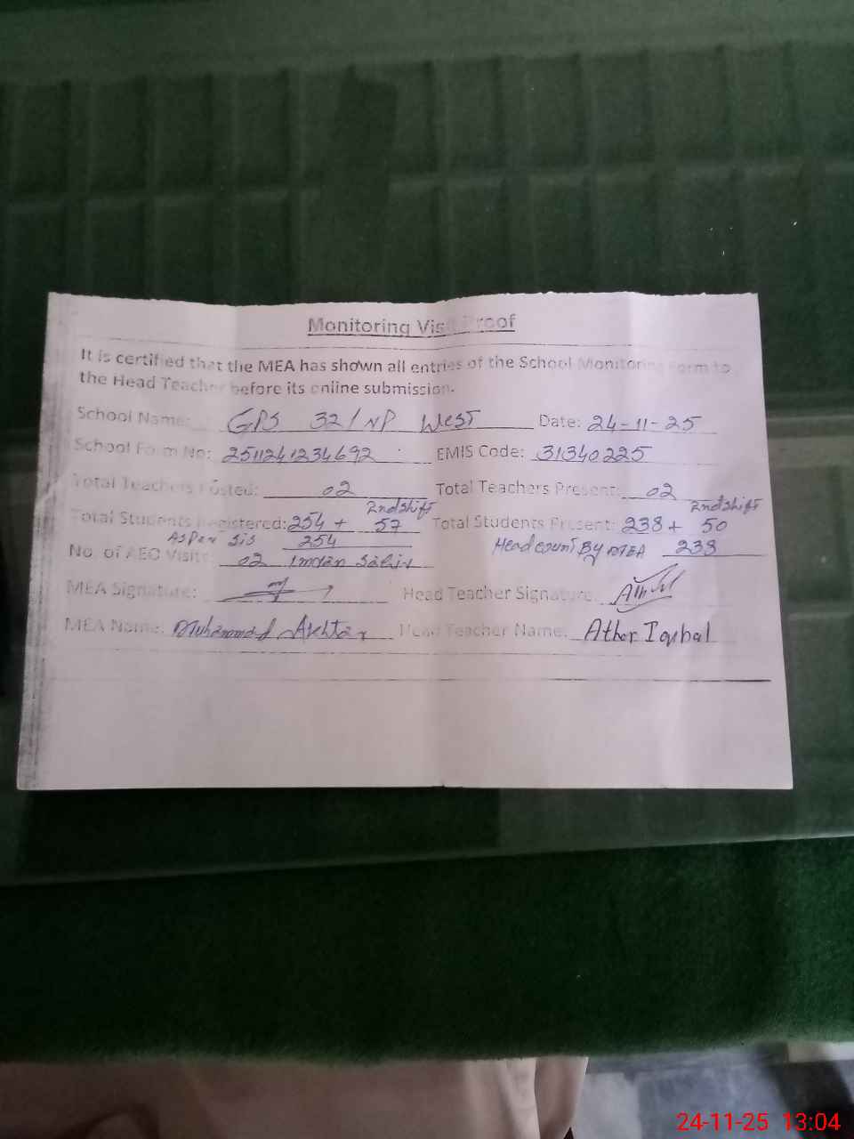 | Attendance Register | Head Teacher | MEA with School | Visit Proof |
