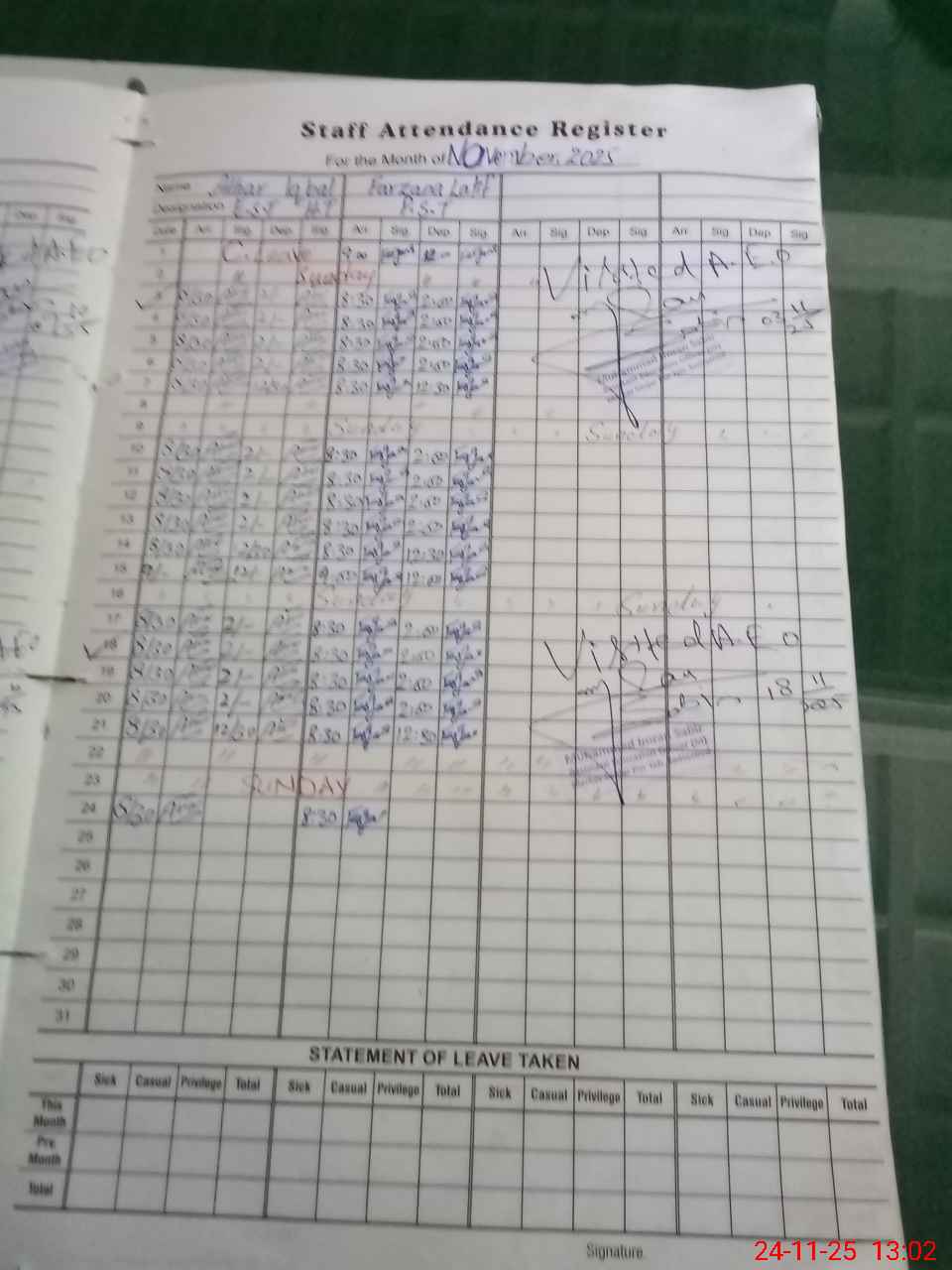 | CNIC | Full Name | Designation | R/C | Absence During Last Calender Month |