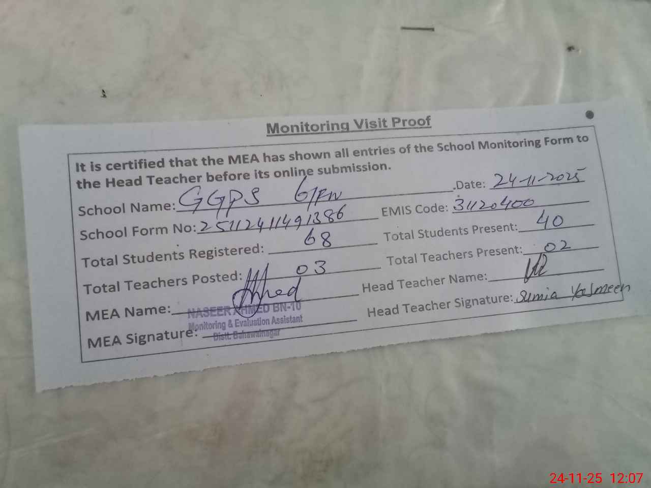 | Attendance Register | Head Teacher | MEA with School | Visit Proof |