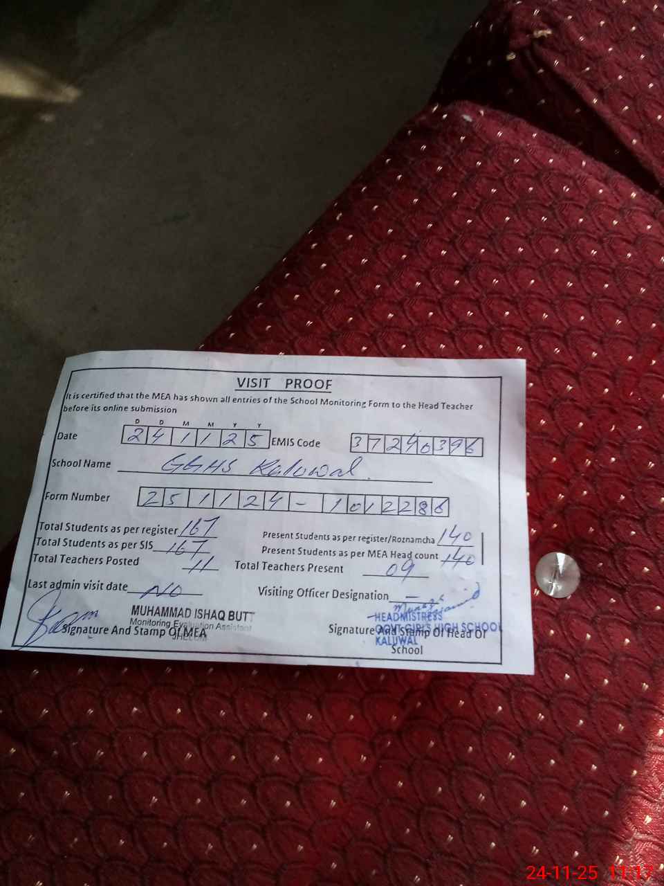| Attendance Register | Head Teacher | MEA with School | Visit Proof |