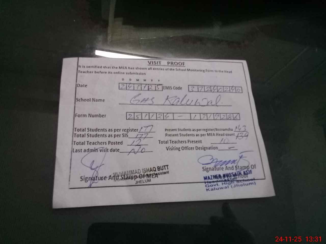 | EMIS Code: 37240240 | Name of School: GHS KALUWAL | |||