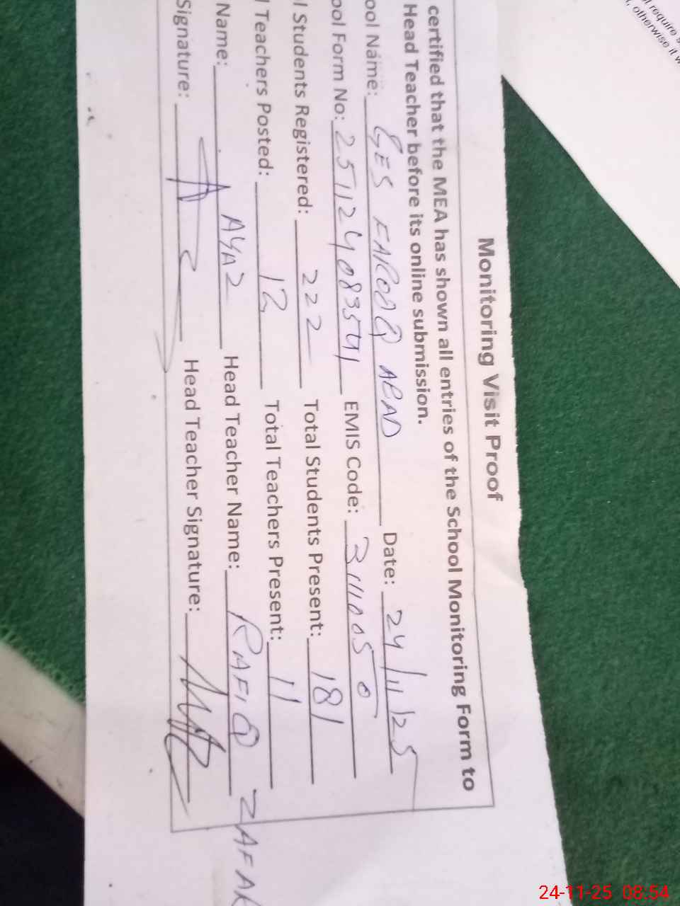 | Attendance Register | Head Teacher | MEA with School | Visit Proof |