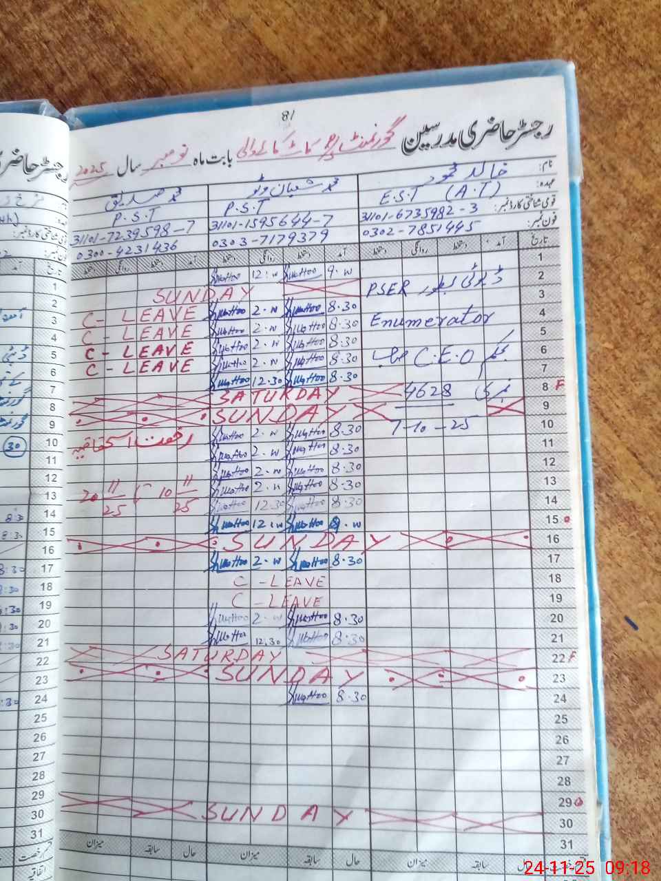 | CNIC | Full Name | Designation | R/C | Absence During Last Calender Month |