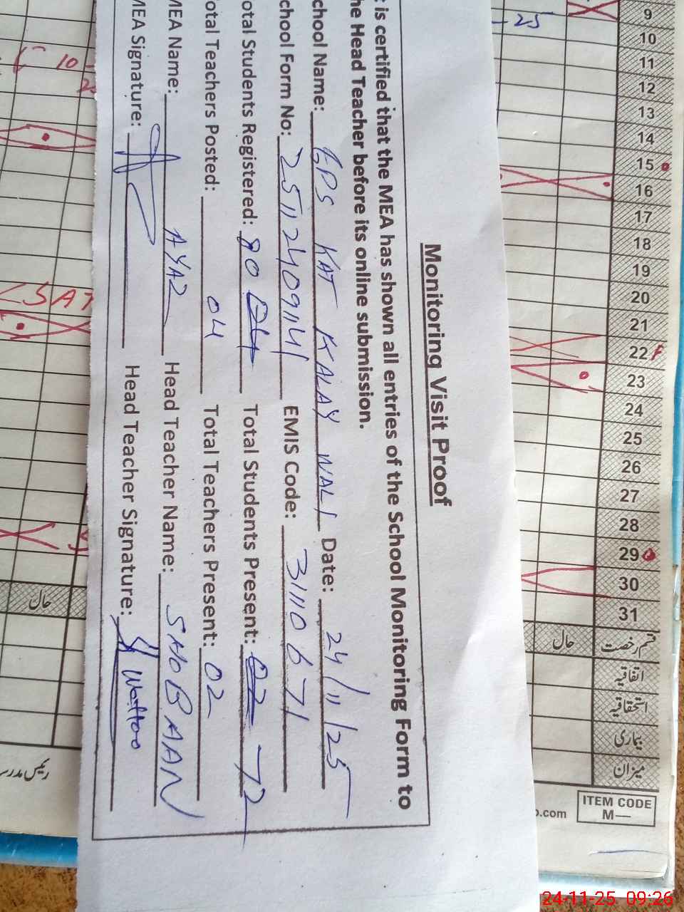 | Attendance Register | Head Teacher | MEA with School | Visit Proof |