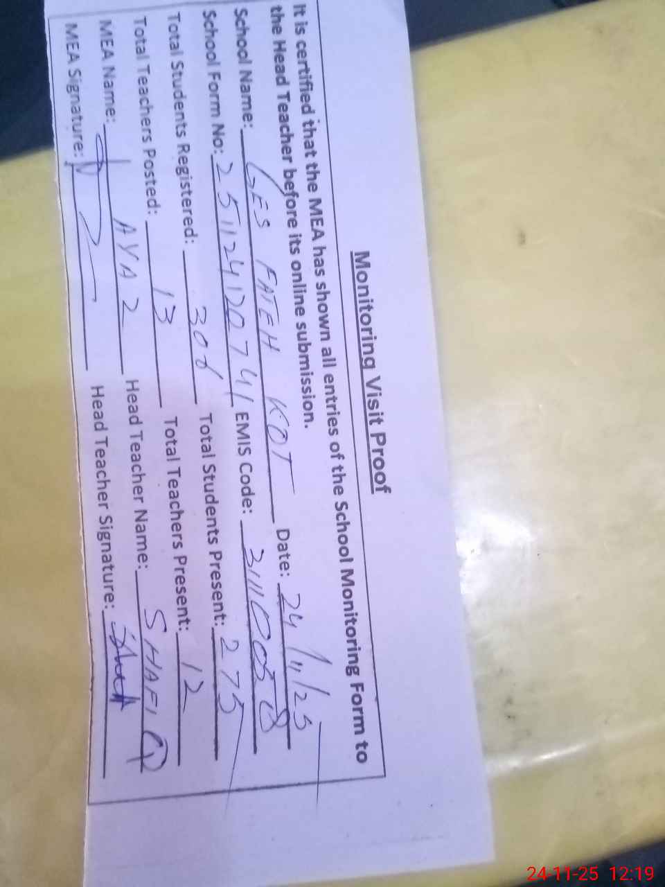 | Attendance Register | Head Teacher | MEA with School | Visit Proof |