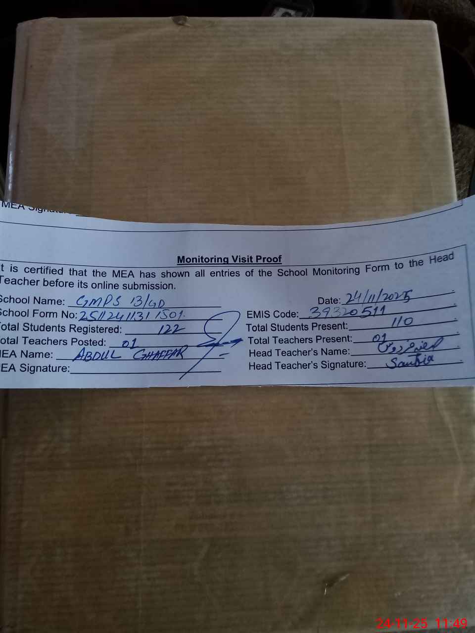 | Attendance Register | Head Teacher | MEA with School | Visit Proof |