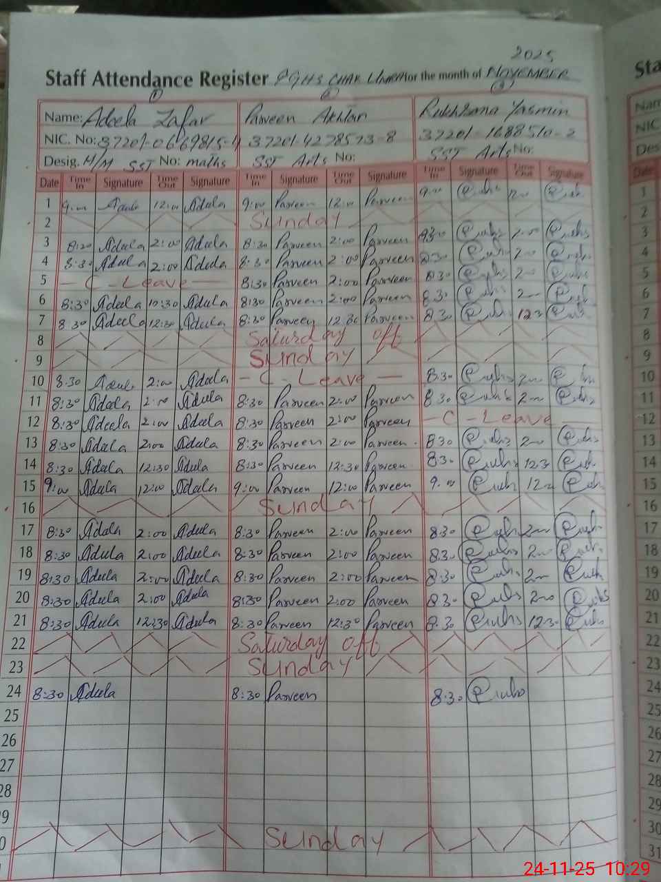 | CNIC | Full Name | Designation | R/C | Absence During Last Calender Month |