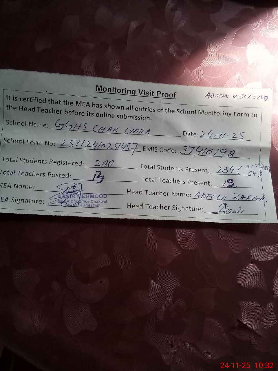 | Name: Ad**** Za**** Designation: (School Headmaster's/Headmistress's) HEADMISTRESS Phone/Cell Number: 03**** |