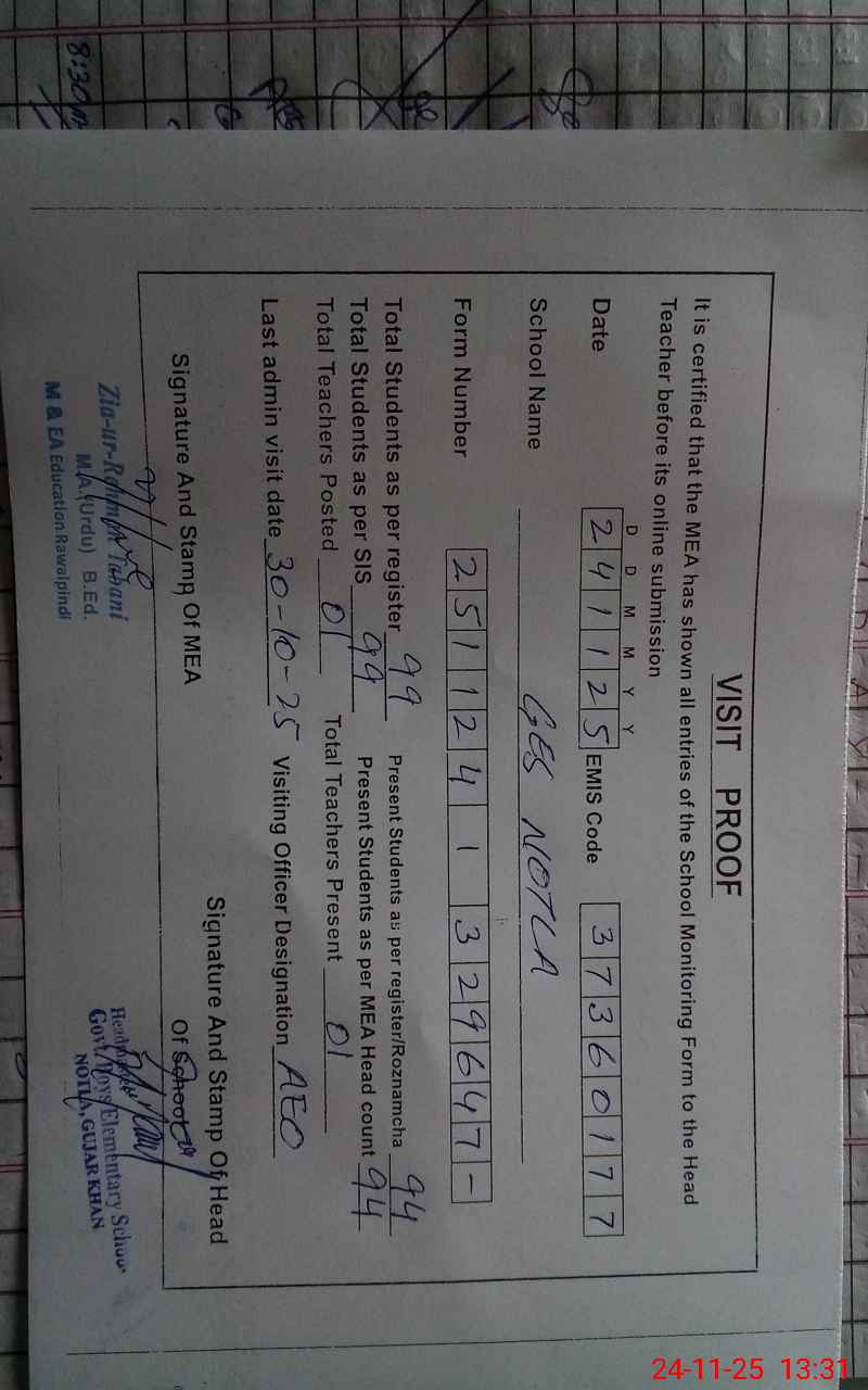 | Certified that this School was Inspected by the Undersigned MEA/DMO Today and the Information Stated Above is as Per Record. | |||||