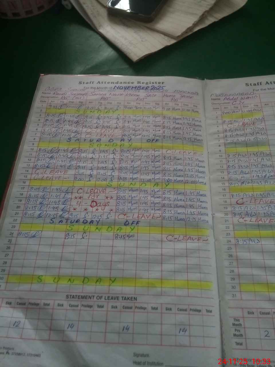 | Leave | Duty | Absent | Maternity | Medical | Ex- Pak |