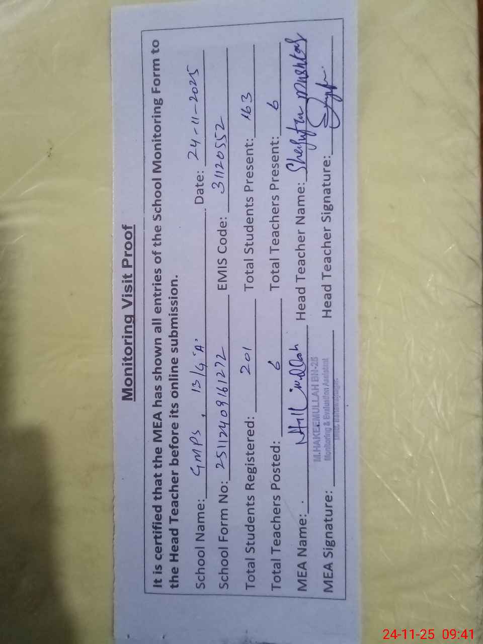 | Attendance Register | Head Teacher | MEA with School | Visit Proof |