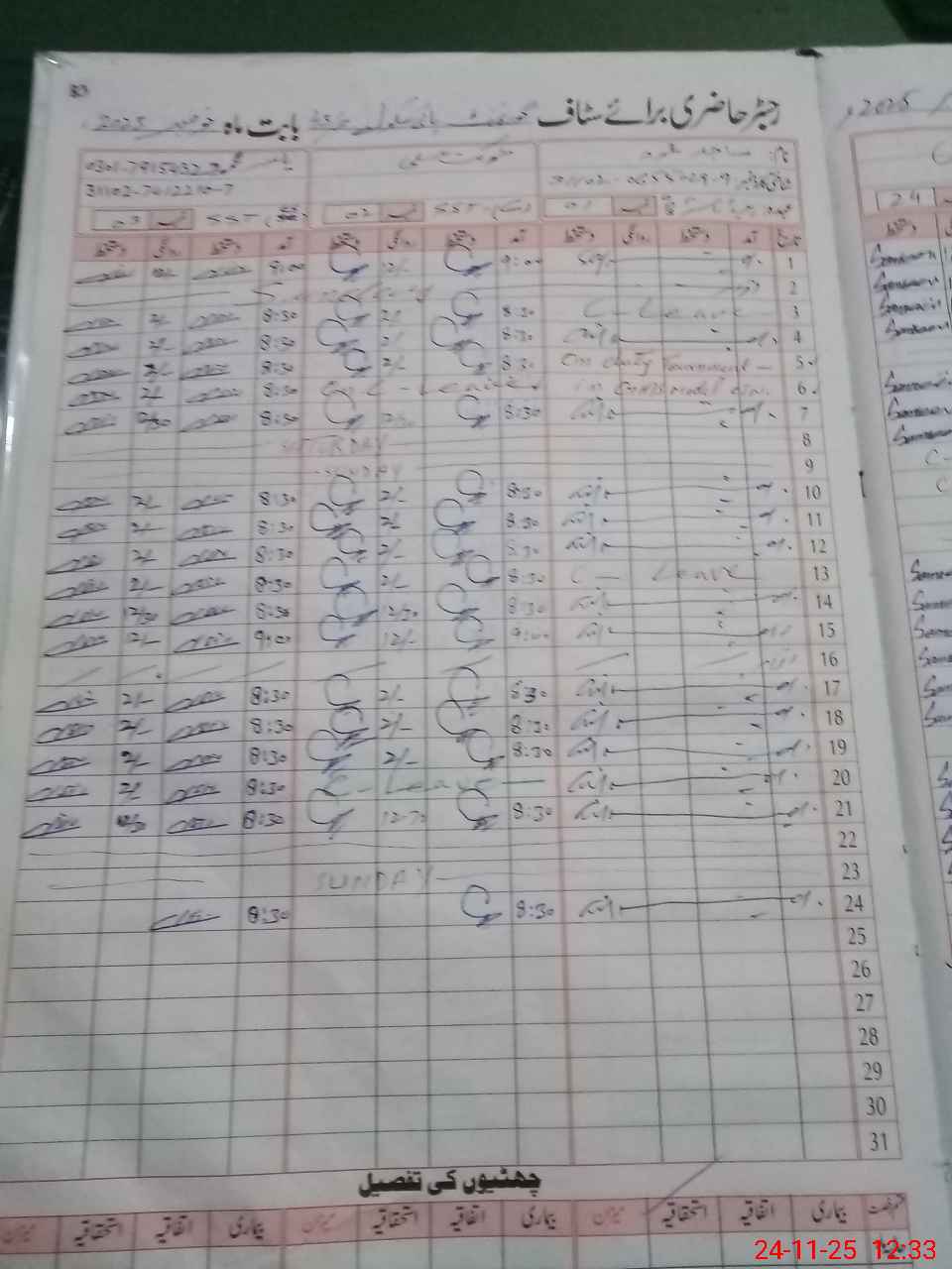 | CNIC | Full Name | Designation | R/C | Absence During Last Calender Month |