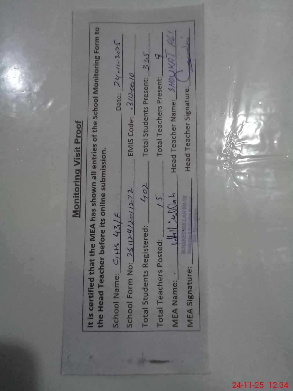| Attendance Register | Head Teacher | MEA with School | Visit Proof |