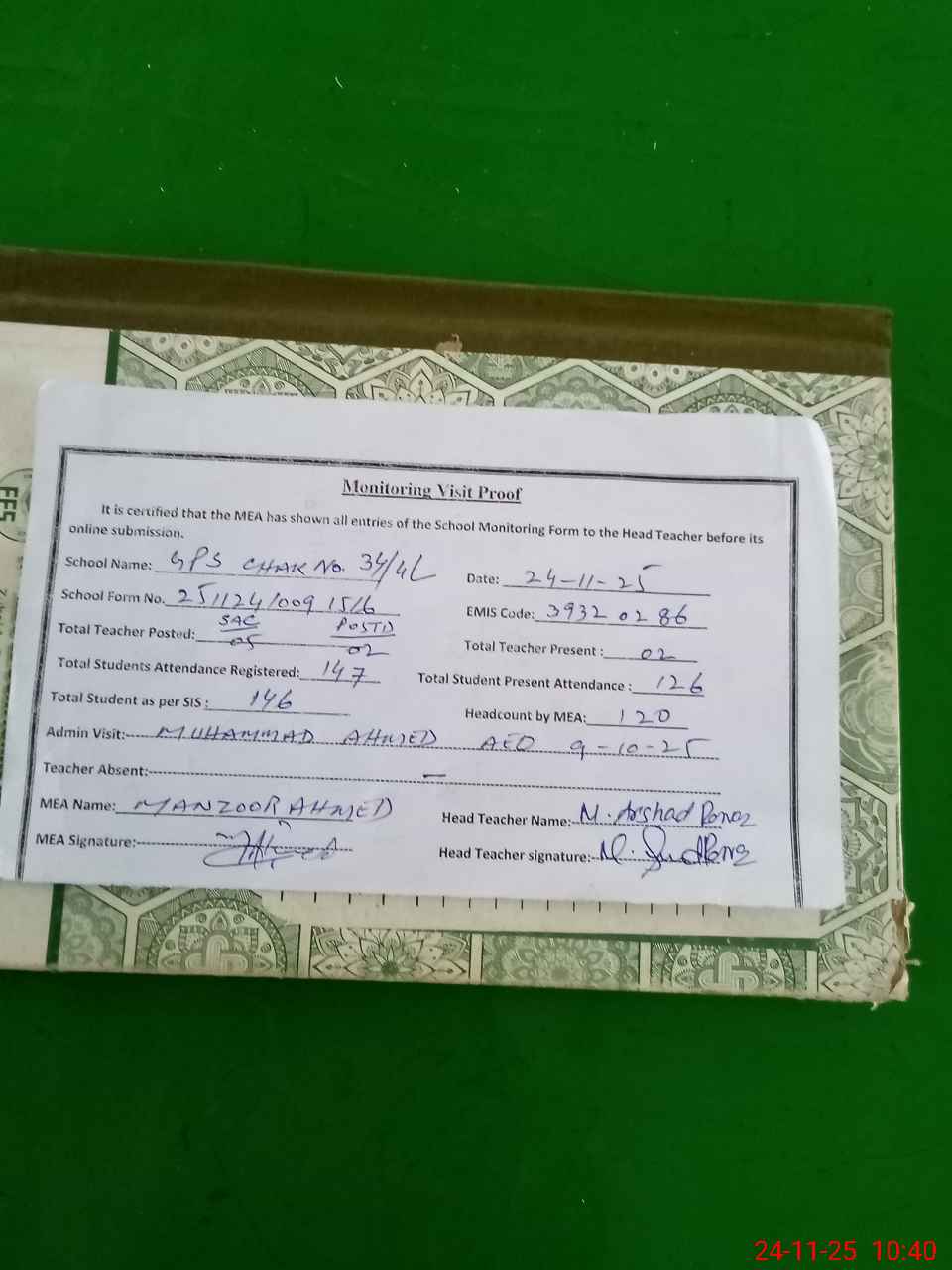 | EMIS Code: 39320286 | Name of School: GPS CHAK NO. 34/4-L | |||
