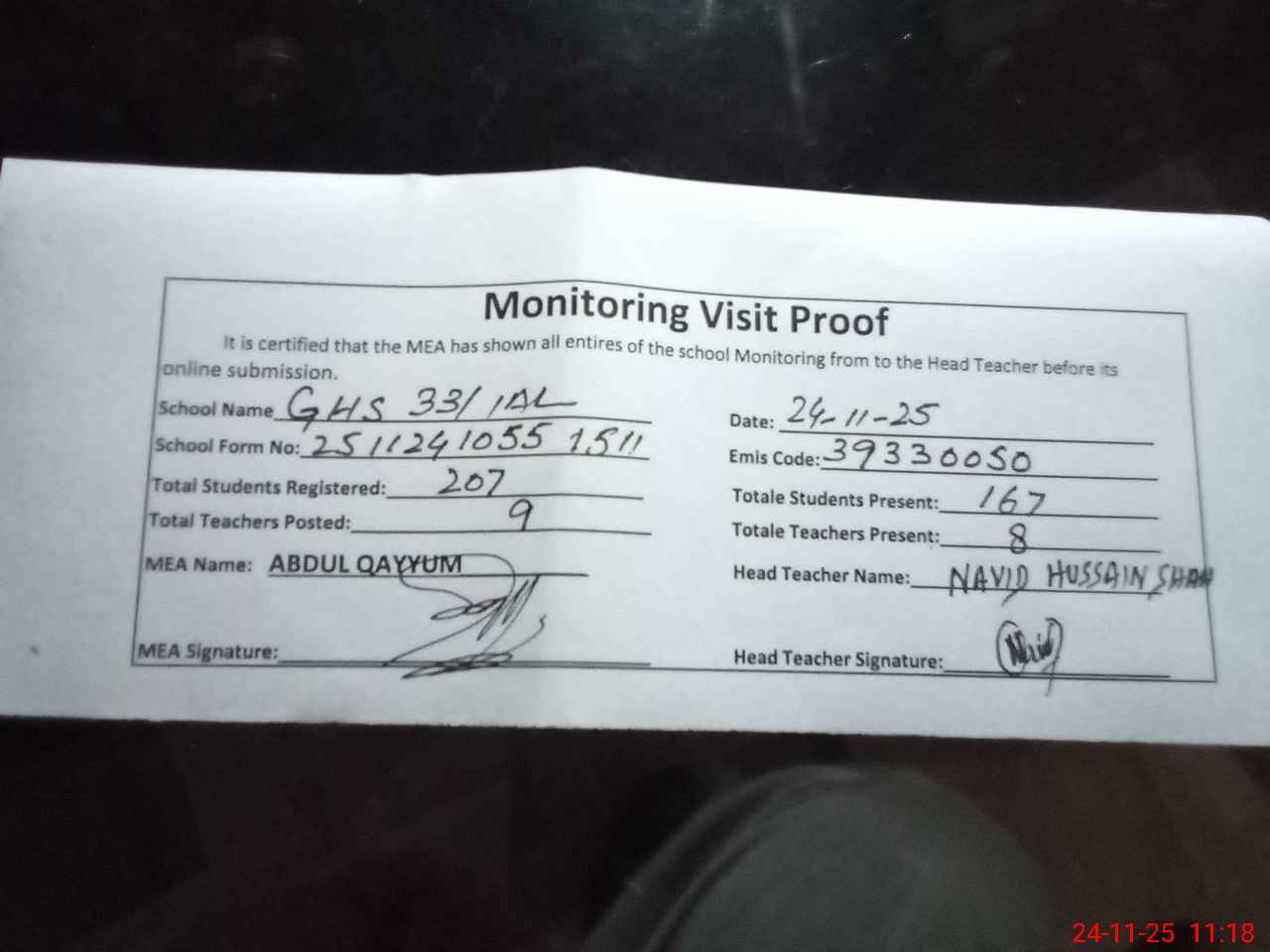 | Attendance Register | Head Teacher | MEA with School | Visit Proof |