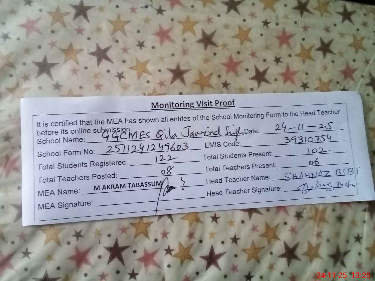 | Attendance Register | Head Teacher | MEA with School | Visit Proof |