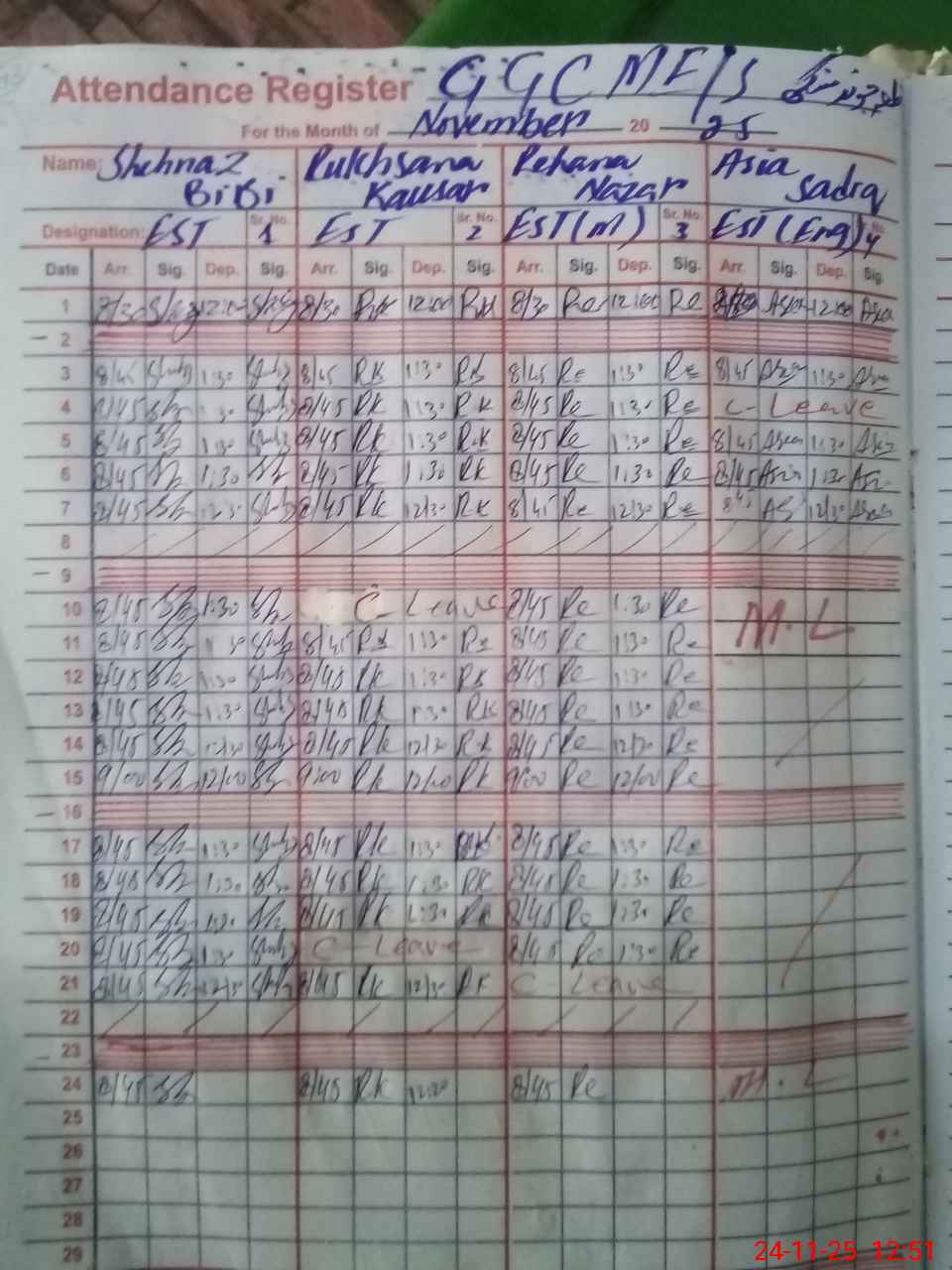 | CNIC | Full Name | Designation | R/C | Absence During Last Calender Month |
