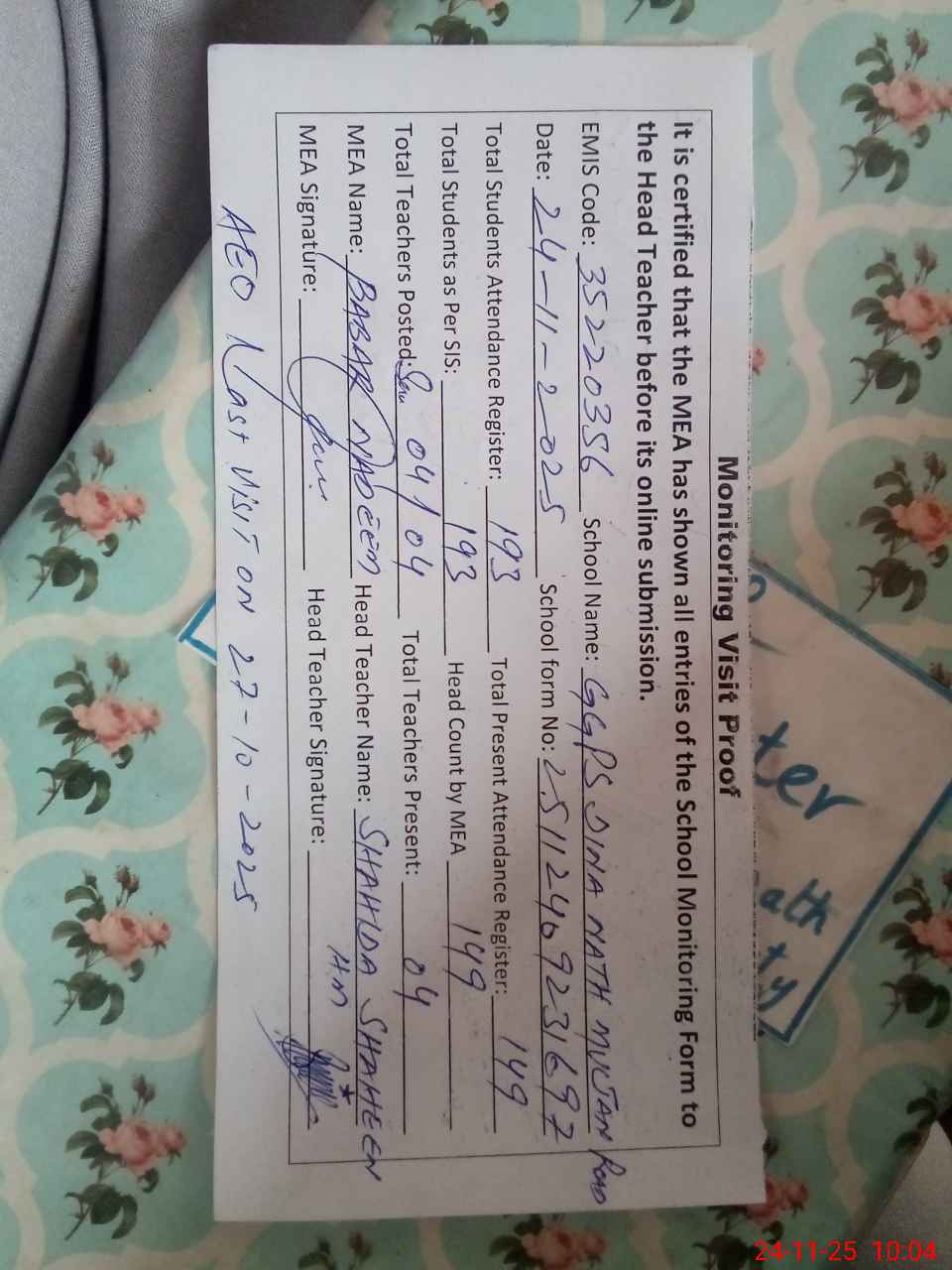 | EMIS Code: 35220356 | Name of School: GGPS DINA NATH MULTAN ROAD | |||