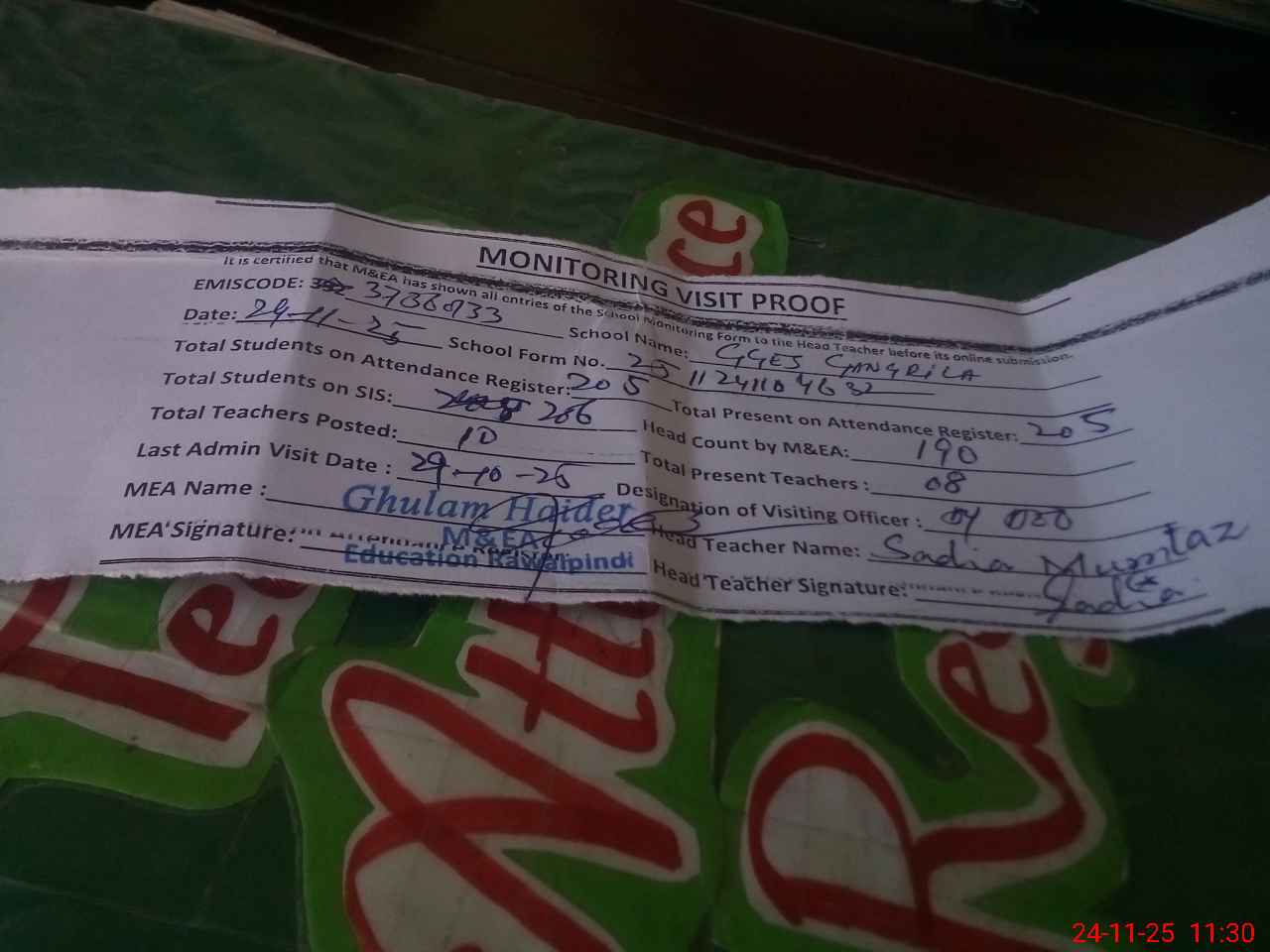 | Attendance Register | Head Teacher | MEA with School | Visit Proof |