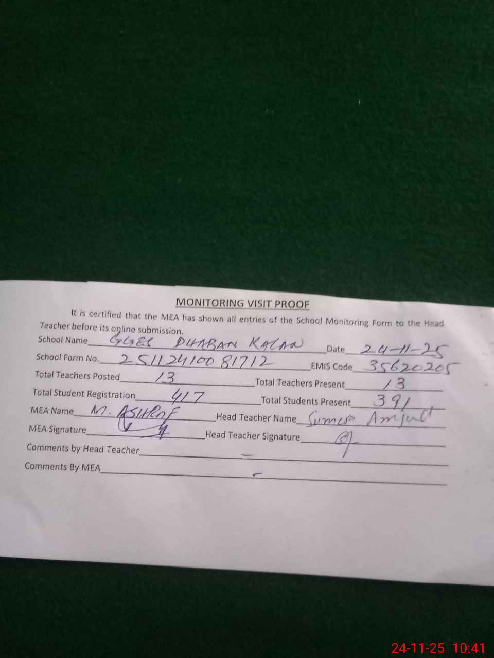 | Attendance Register | Head Teacher | MEA with School | Visit Proof |