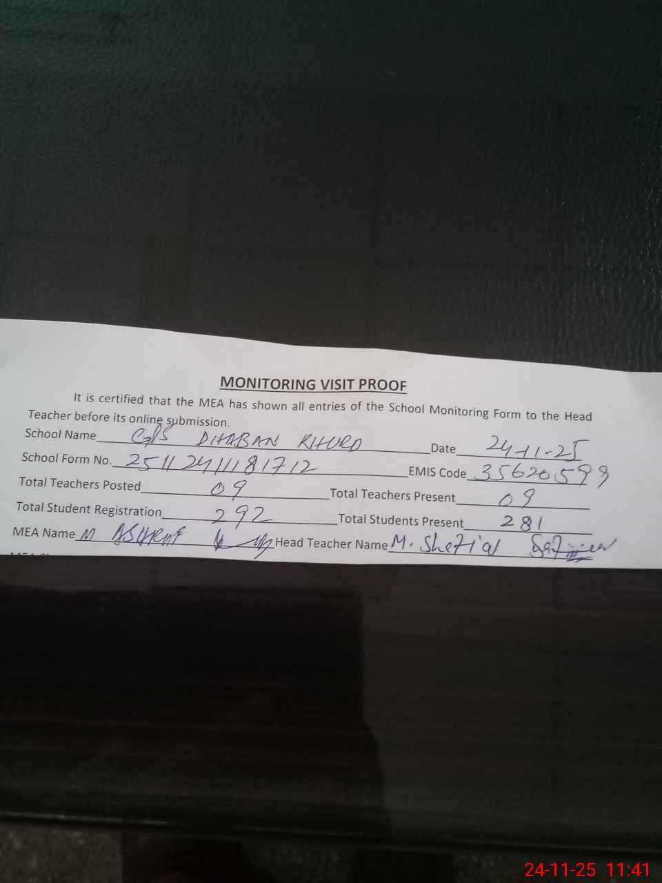 | Attendance Register | Head Teacher | MEA with School | Visit Proof |