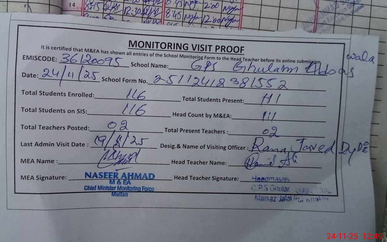 | EMIS Code: 36120095 | Name of School: GPS GHULAM ABAS WALA JALAL PUR KHAKHI TEH.SHUJABAD | |||