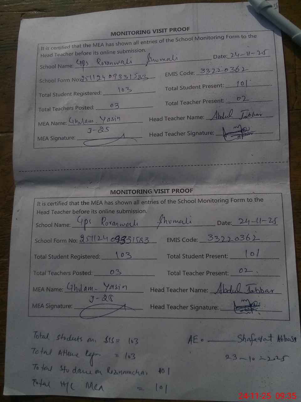 | Attendance Register | Head Teacher | MEA with School | Visit Proof |