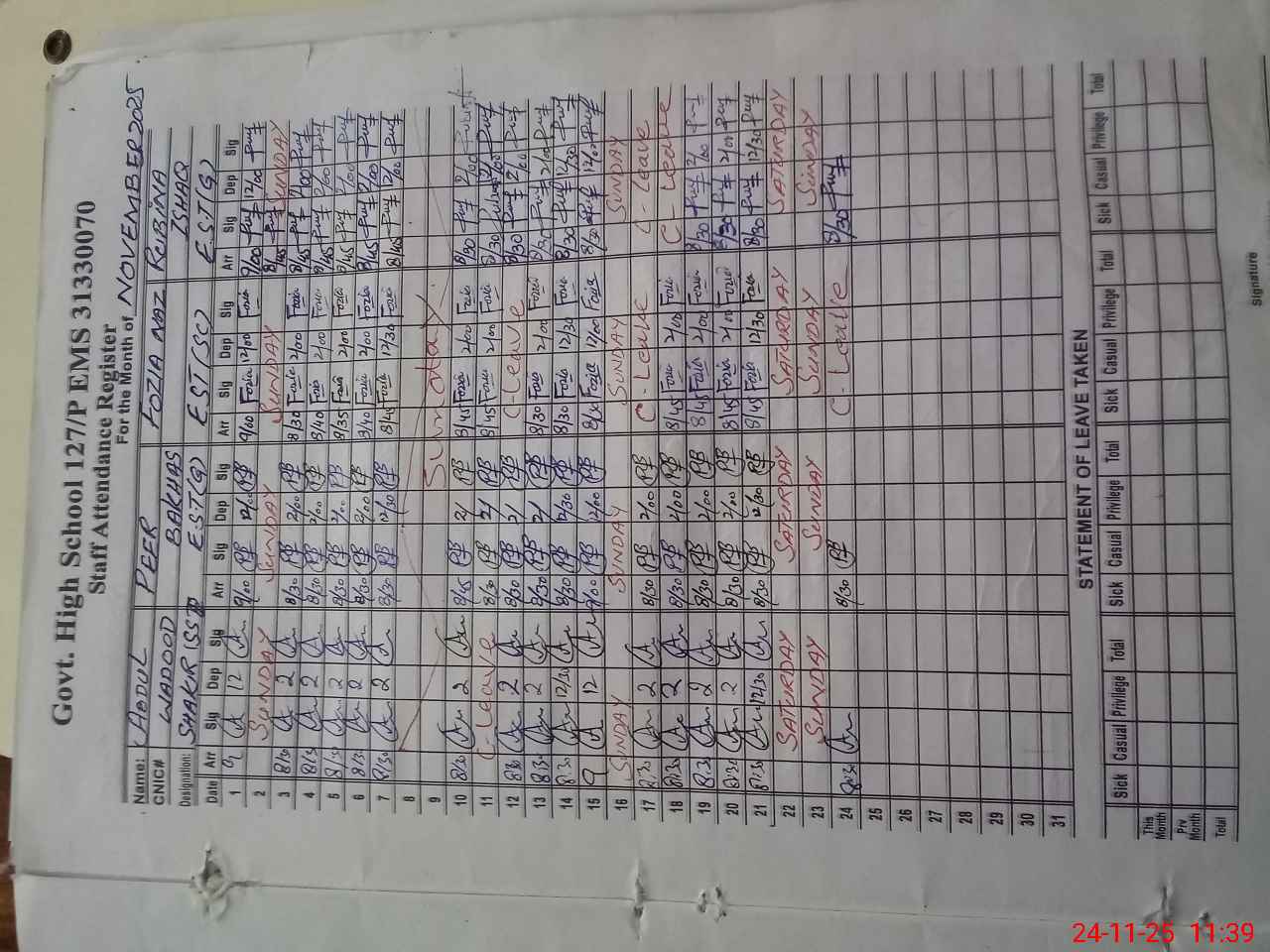| CNIC | Full Name | Designation | R/C | Absence During Last Calender Month |