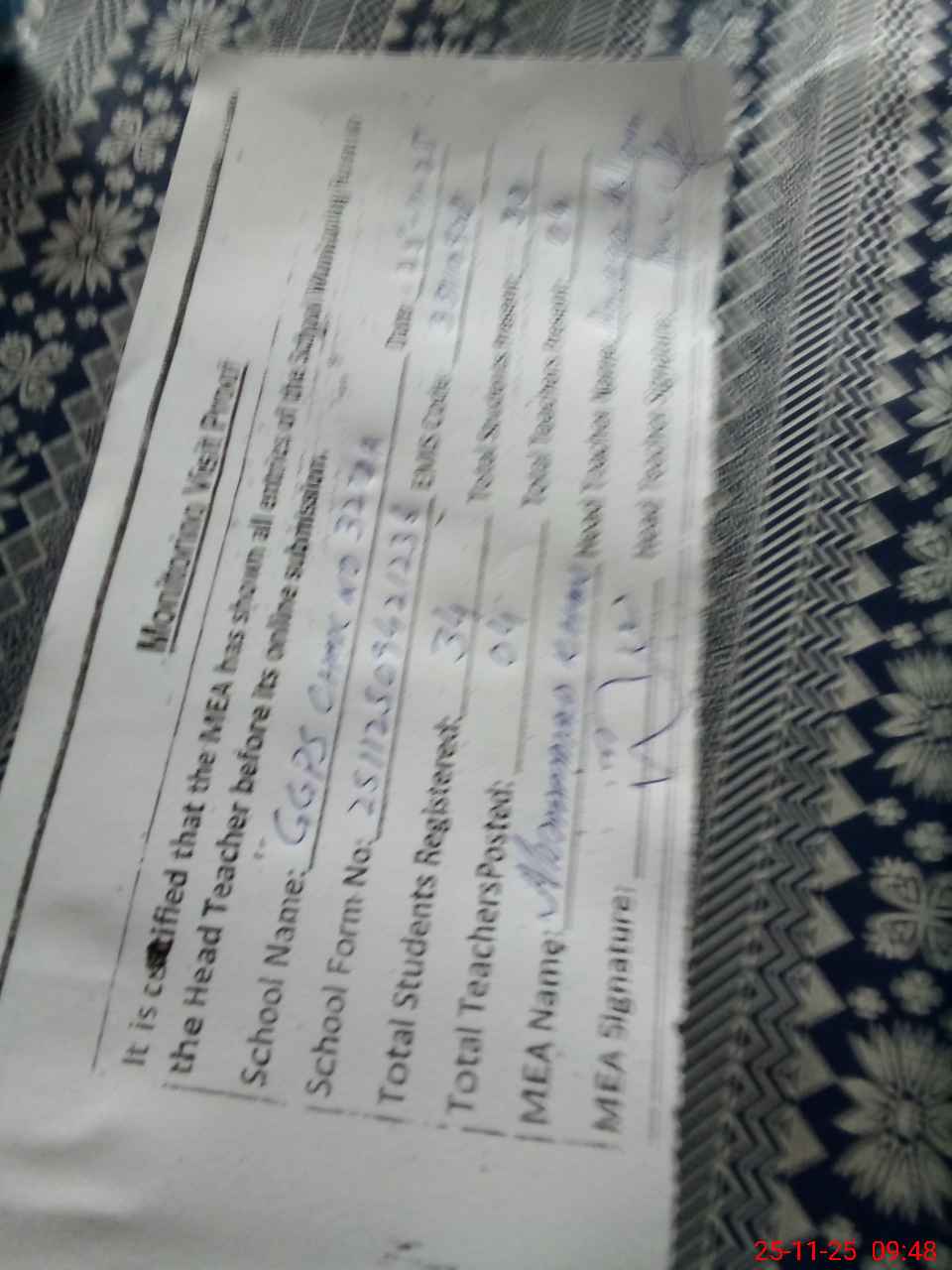 | Attendance Register | Head Teacher | MEA with School | Visit Proof |