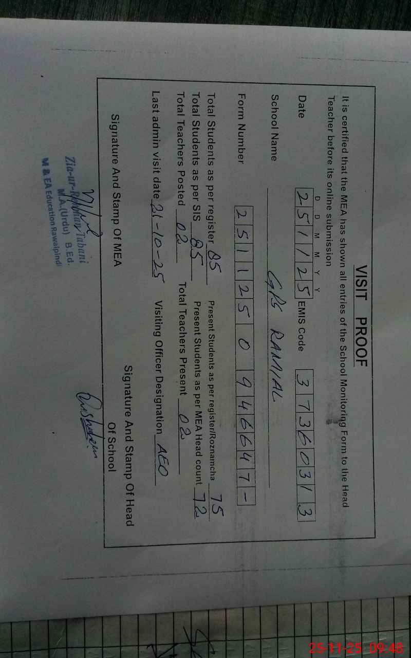 | Attendance Register | Head Teacher | MEA with School | Visit Proof |