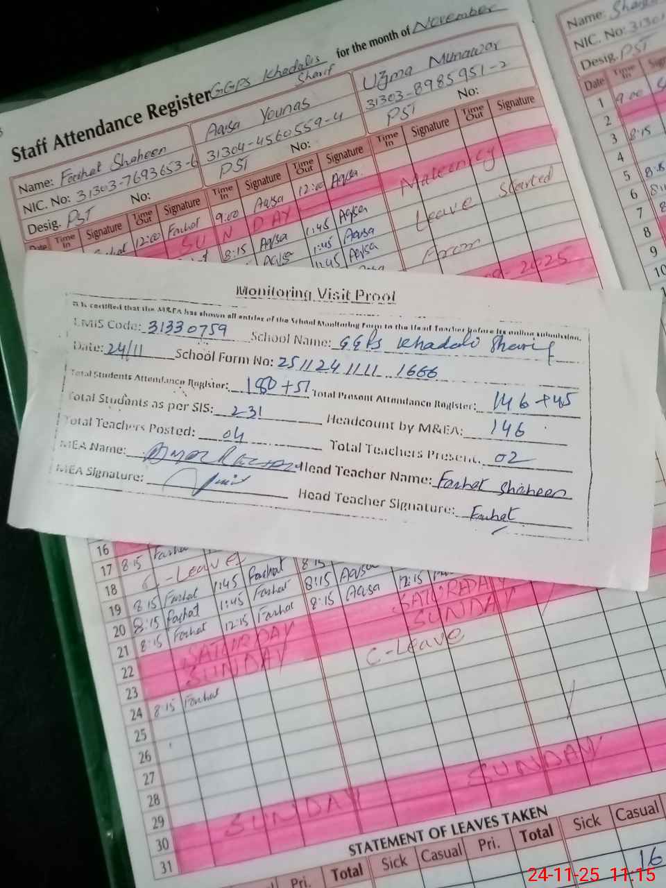 | Attendance Register | Head Teacher | MEA with School | Visit Proof |