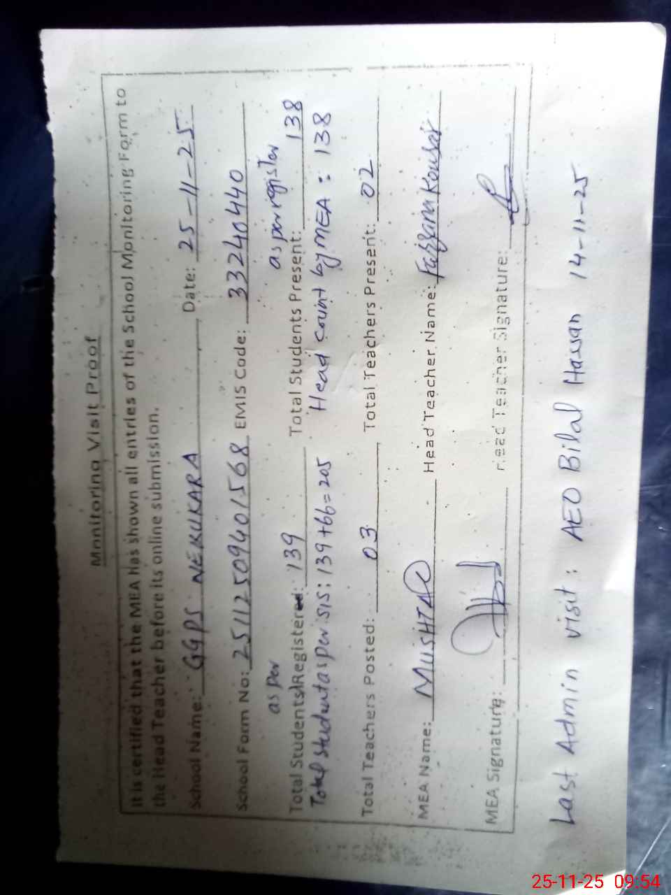 | Attendance Register | Head Teacher | MEA with School | Visit Proof |